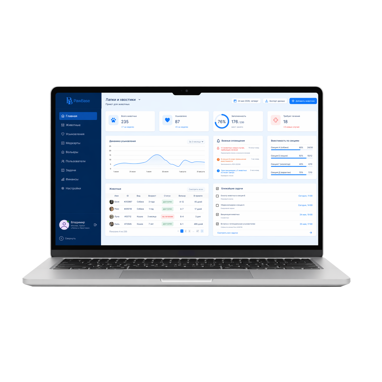 PawBase — концепт SaaS-платформы для управления приютами для животных и реабилитационными центрами. Проект инициирован частной сетью приютов, планирующей масштабирование: при росте числа филиалов и волонтёрского состава стало невозможно поддерживать качество работы без единой системы.